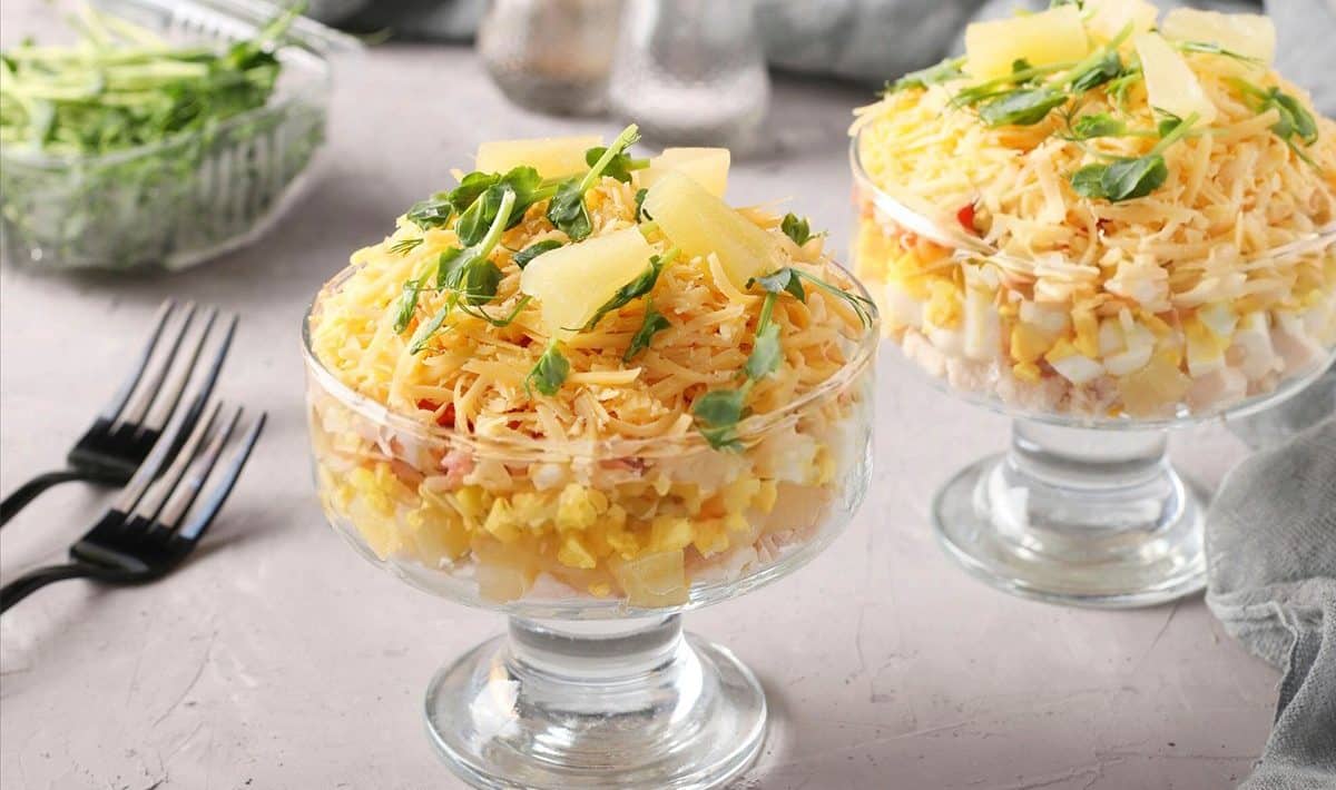 Nemožno poprieť, že táto kombinácia sa buď páči, alebo nie, ale hlavné je, aby ste sa nenechali odradiť už len pri pomyslení na ňu. Chrumkavá kapusta a jemné kuracie mäso sa skvele hodia k sladkému, šťavnatému ovociu . Používame konzervovaný ananás, aby sme urýchlili proces prípravy, ale nezabudnite dôkladne scediť tekutinu, inak bude šalát nechutný a na dne bude viditeľná vrstva slaného nálevu.